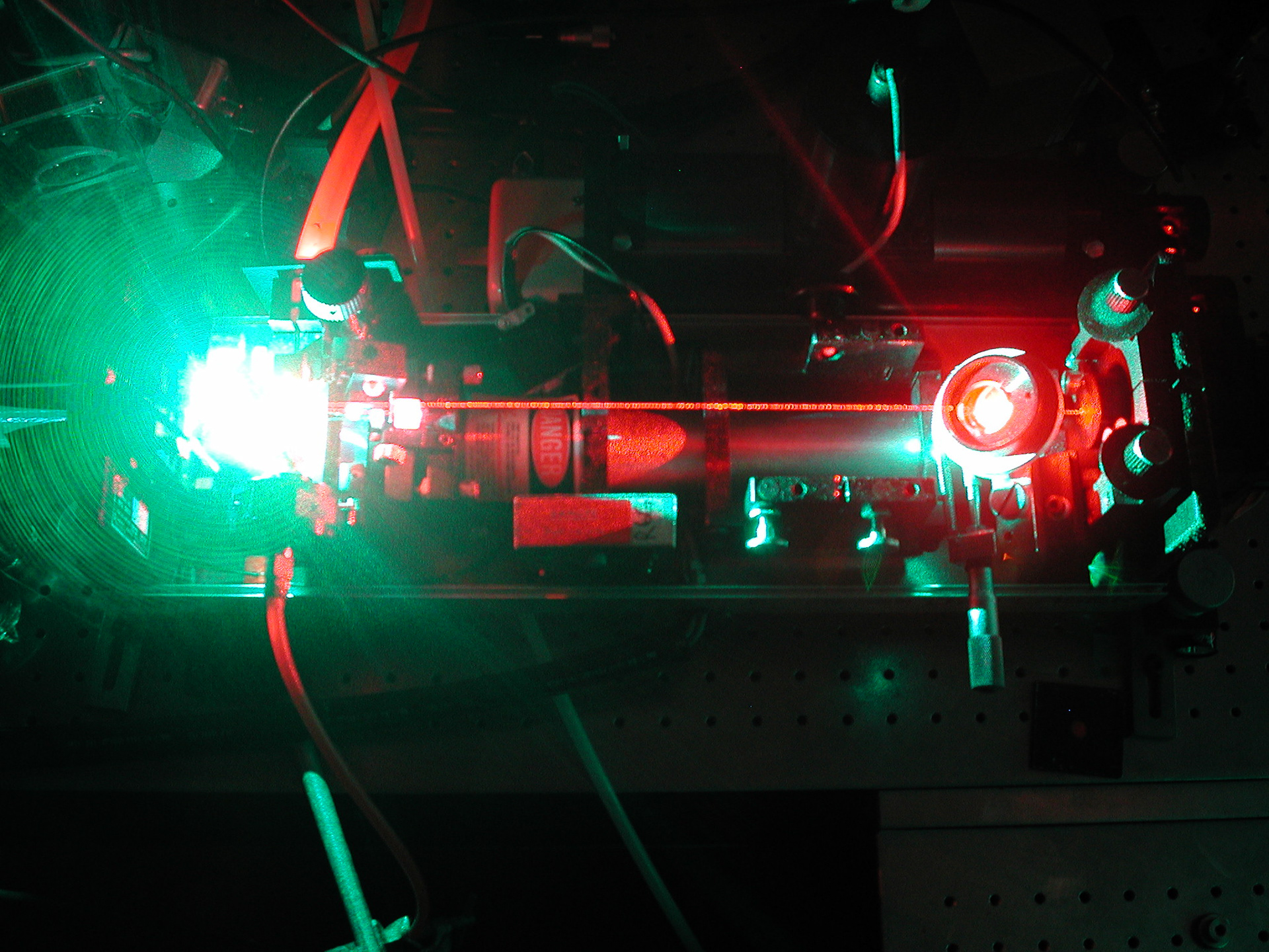 I began with capturing profile still images of the laser beams as they travelled from one mirror to another, at the same time imaging the speckle patterns falling on the surrounding walls and scientific instruments. (Speckle pattern is a by-product of laser beam light. This pattern takes the irregular form of a grainy bright light mass that seems to float as the viewer changes position in relation to the fall of light.) Those images did not convey the physical spectacle and spiritual wanderings that I was experiencing while working with this unfamiliar light source. The great sense of movement and time that I was surrounded by in the laboratory had been lost in the rendering of still imagery. I decided to introduce digital video cameras to the project in an attempt to portray what was happening before me, around me as I was completely immersed in this strange light. The capturing of the light source as moving digital data has helped realise this experience on screen.